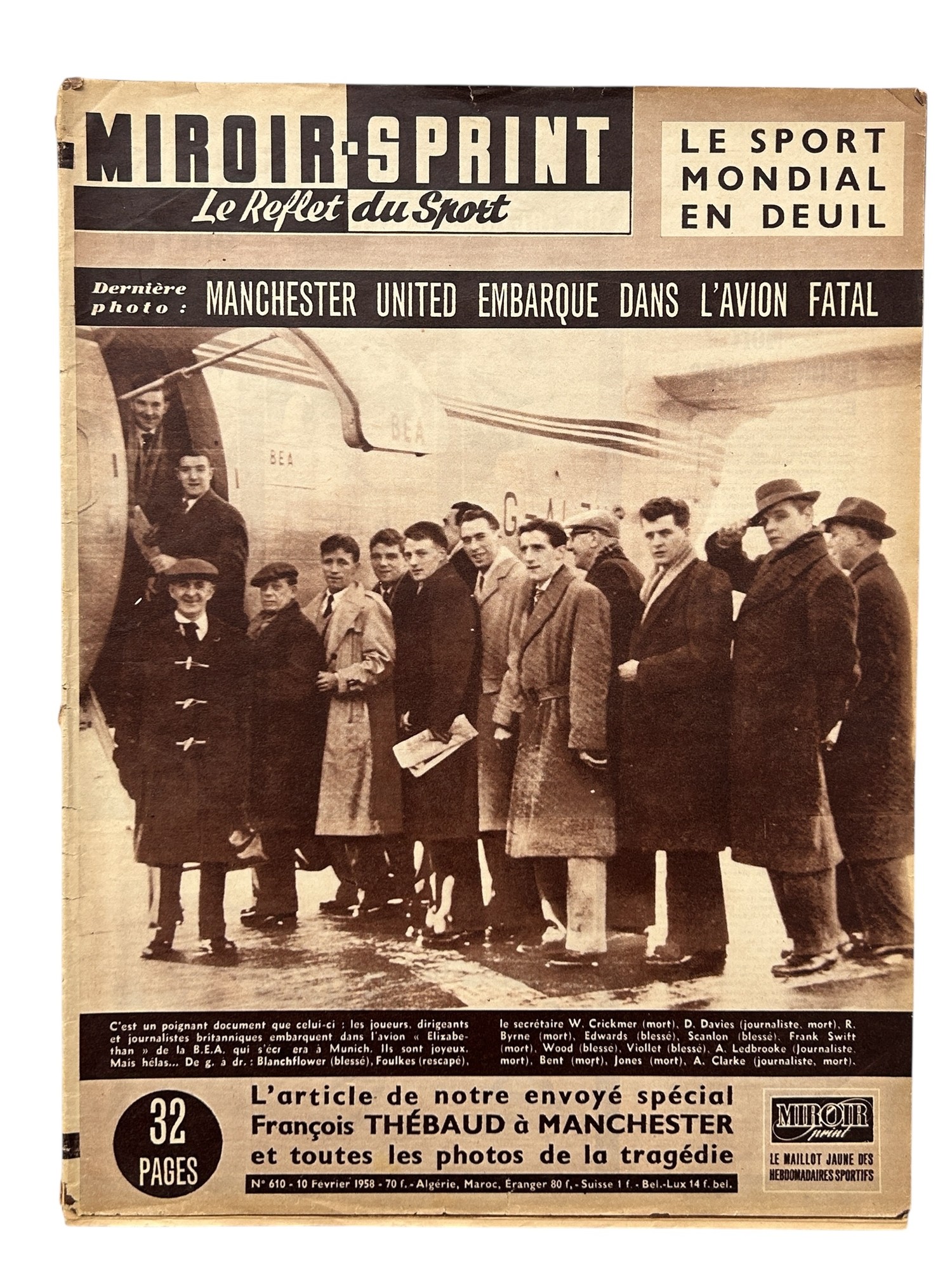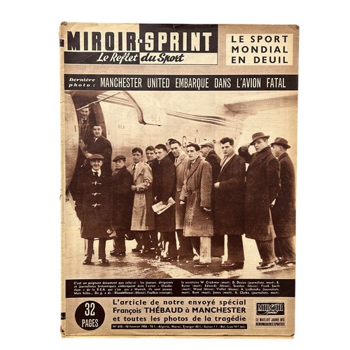 1958 MUNICH AIR DISASTER, FRENCH MAGAZINE ISSUE, MIROIR - SPRINT, 10/2/1958, WITH A PICTURE ON THE FRONT COVER OF THE MANCHESTER UNITED TEAM ABOUT TO BOARD PLANE. INSIDE THERE ARE PICTURES AND REPORTS ON PAGES 2, 3, 12 AND 13 PLUS 2 PAGES FROM THE ILLUSTRATED LONDON NEWS 15/2/1958 WITH PICTURES OF THE AFTERMATH. GENERALLY GOOD.