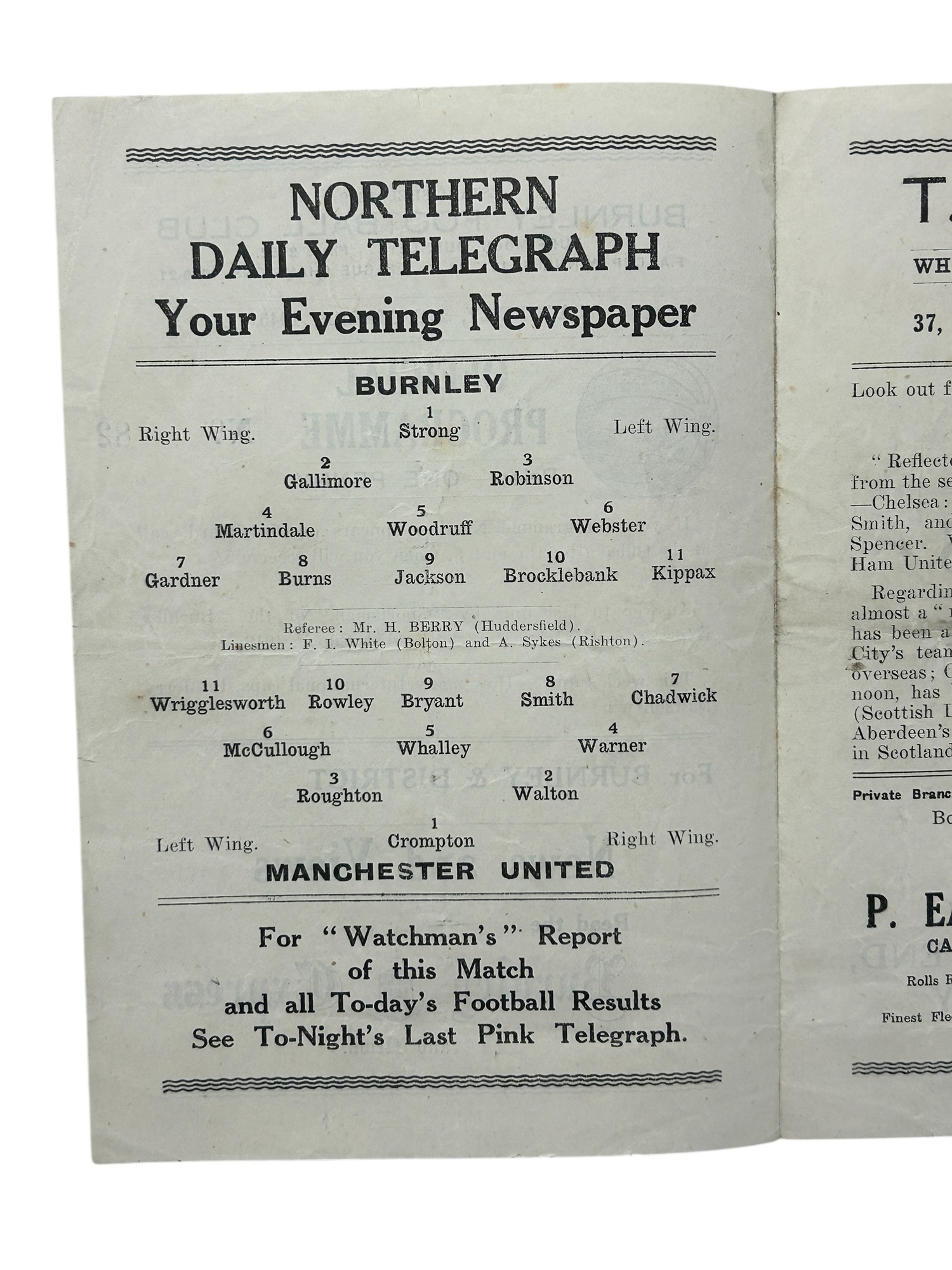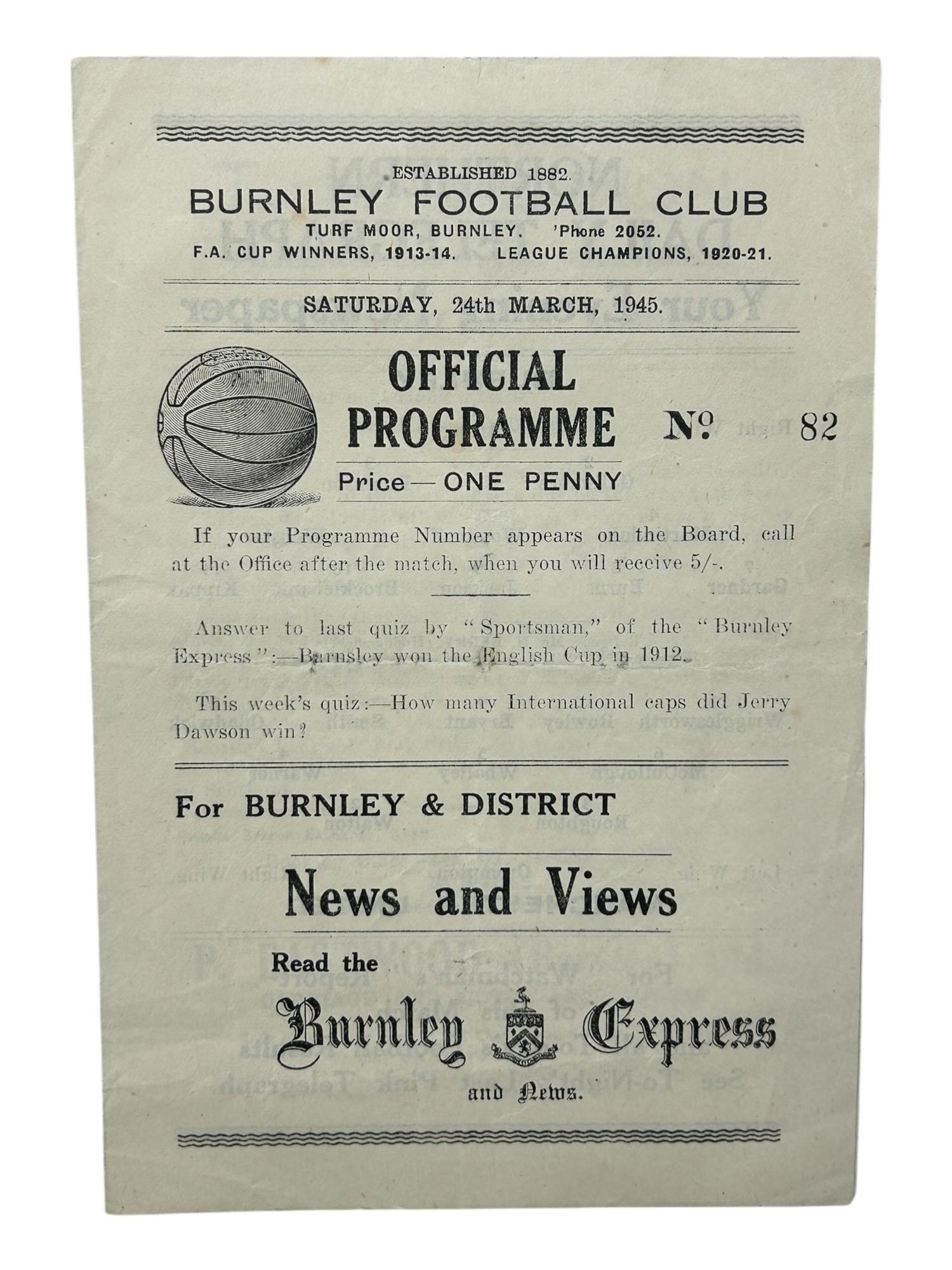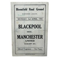 MANCHESTER UNITED AWAY VERSUS BURNLEY 1944/45 FOOTBALL PROGRAMME, 24/03/1945, 4-PAGE ISSUE. GENERALLY GOOD.