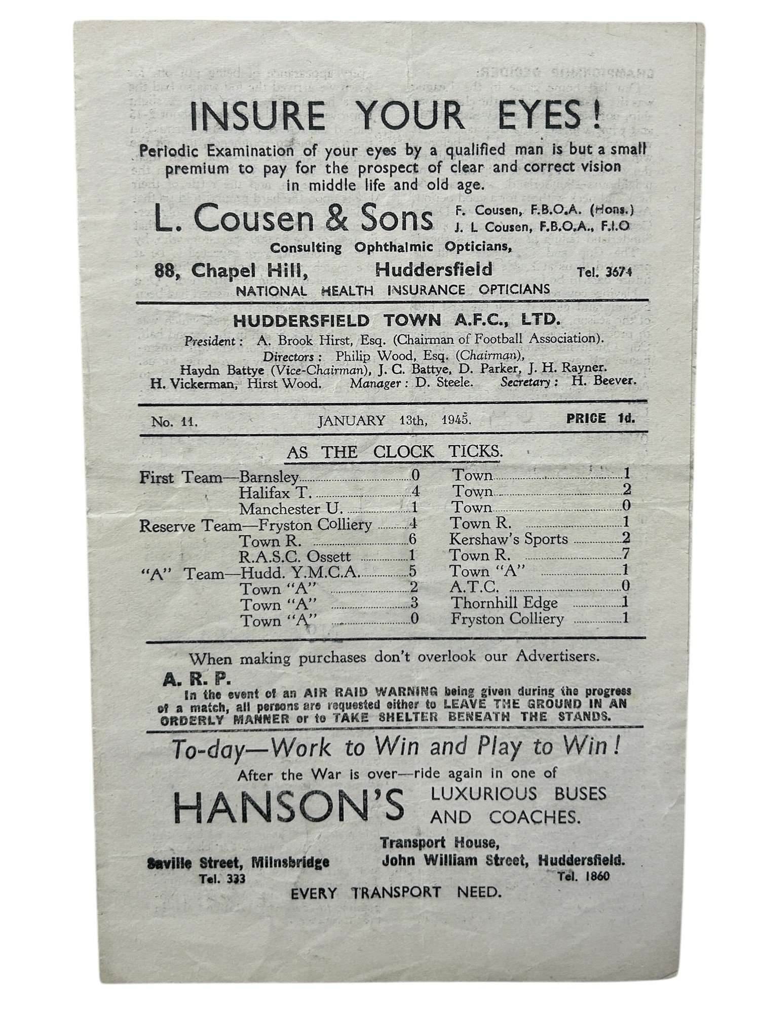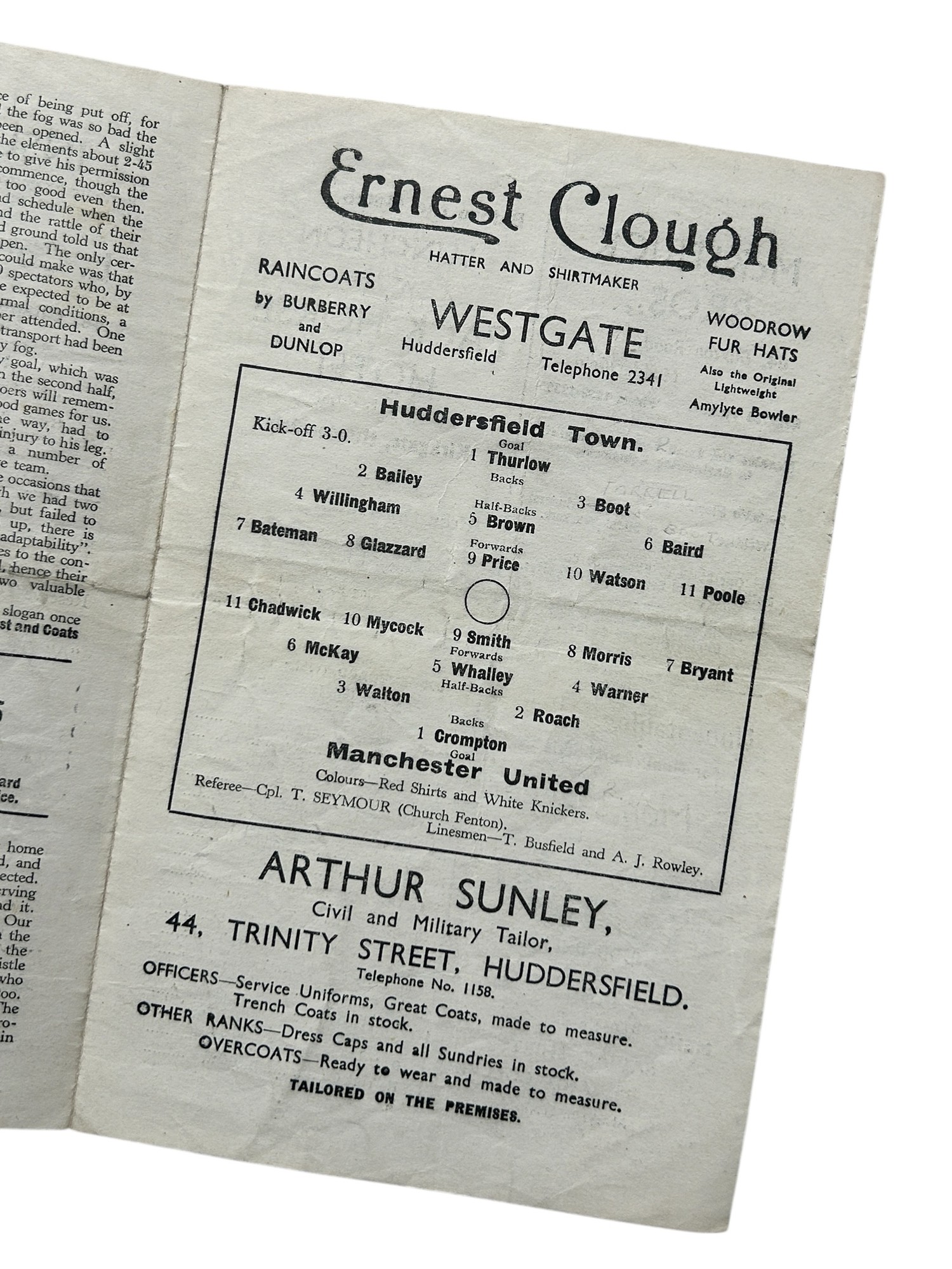 MANCHESTER UNITED AWAY VERSUS HUDDERSFIELD TOWN 1944/45 FOOTBALL PROGRAMME, 13/01/1945, WAR TIME 4-PAGE ISSUE. MINOR CREASES.